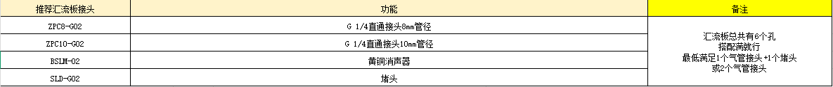 1、汇流板接头:选择接头管径,通常为8mm或10mm。通用配置包括1个进气接头、1个堵头和4个消声器。