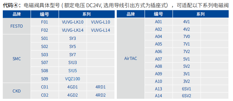 3、选择所需电磁阀型号。下图是目前阀岛适配的电磁阀品牌和系列,若您所需不在其中,请联系我们,我们将根据电磁阀尺寸、出线方式、接头位置等为您比对适配型号。