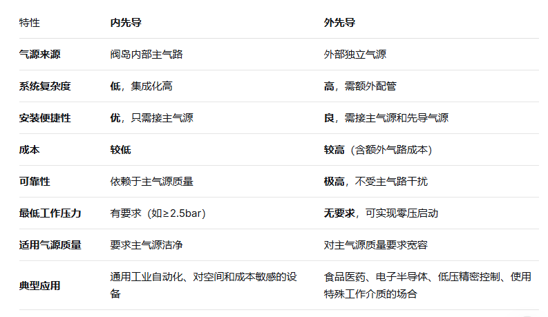 4、根据工况要求选择先导方式。一般情况下,内先导即可满足需求;若存在低压启动的特殊要求,则可选用外先导。具体选型界面及两种方式的区别如下: