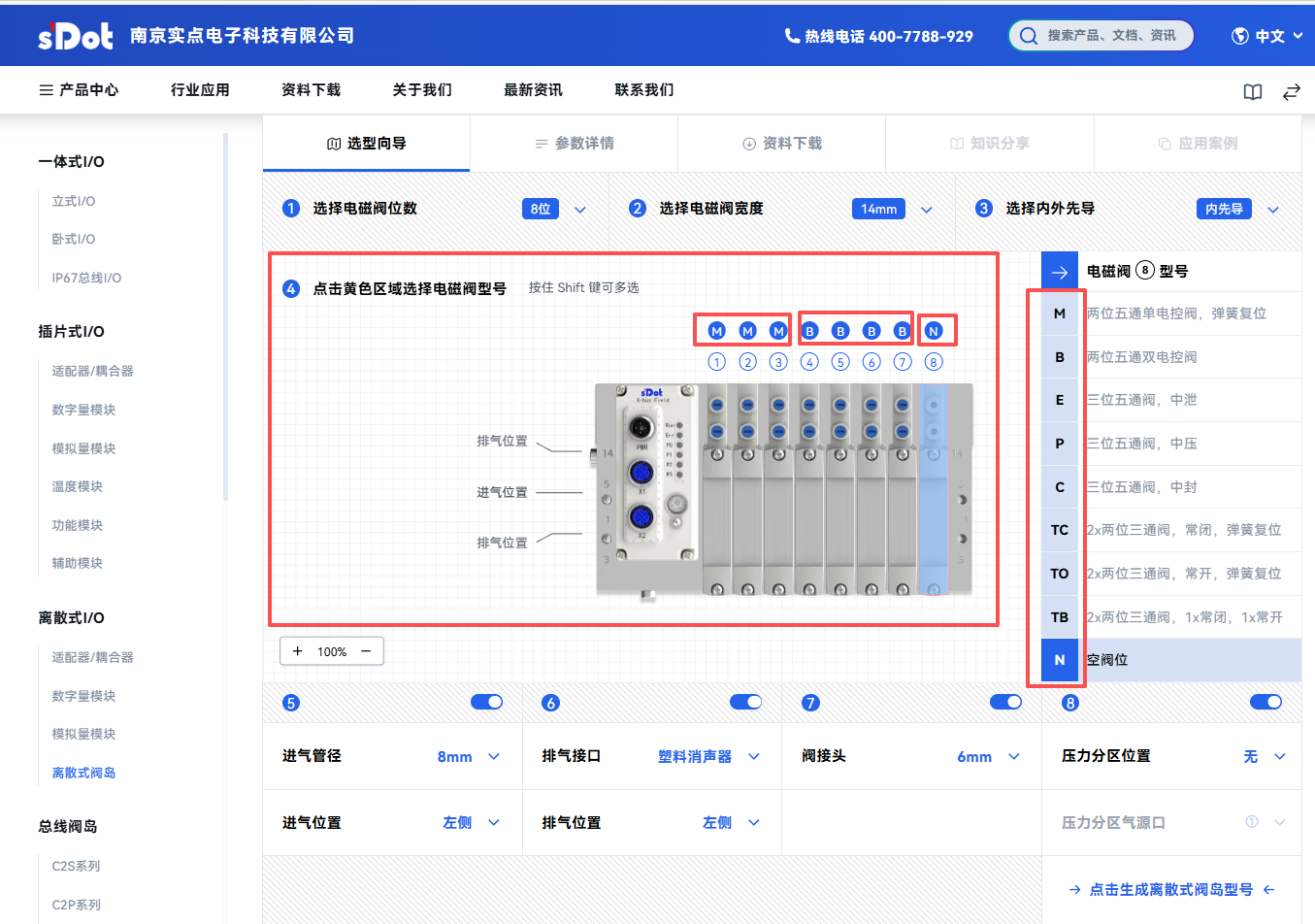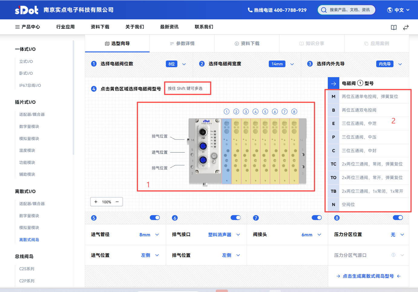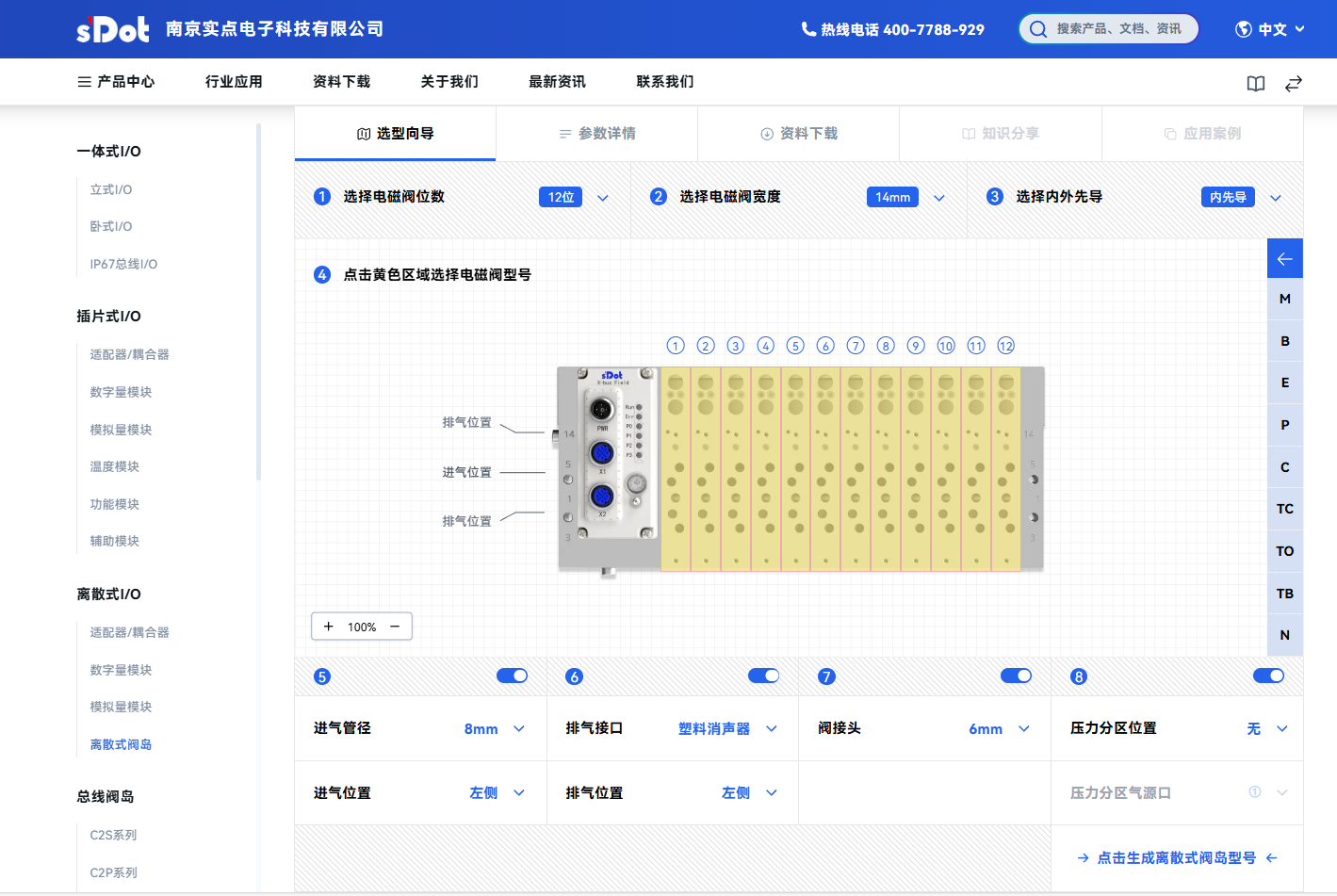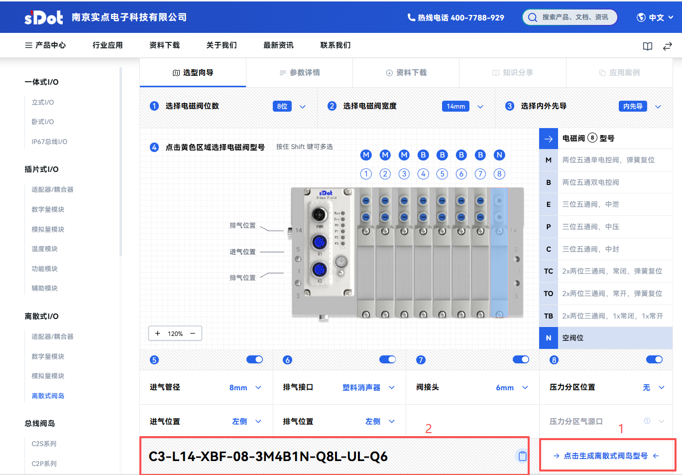 1、访问实点科技官网(https://www.solidotech.com),随后参照下列图示顺序,进入C3系列离散式阀岛选型页面。
