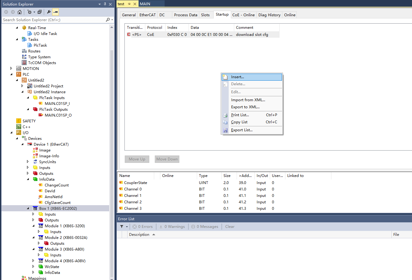 启动参数里面添加的参数在启动总线时会下发一次,在startup空包界面右键,选择“insert”。弹出SDO参数窗口,选择对应模块的Config参数,更改值到所需配置,点击OK完成,下载生效。