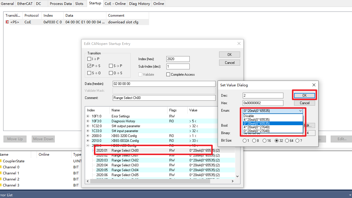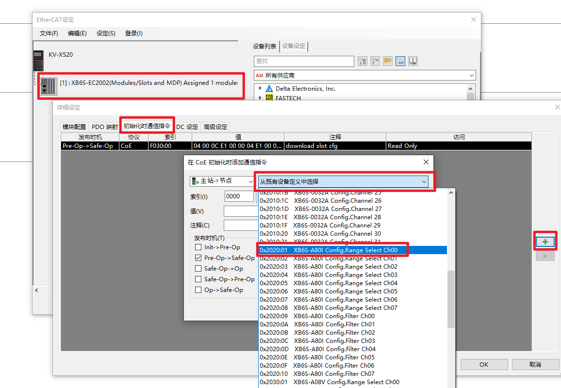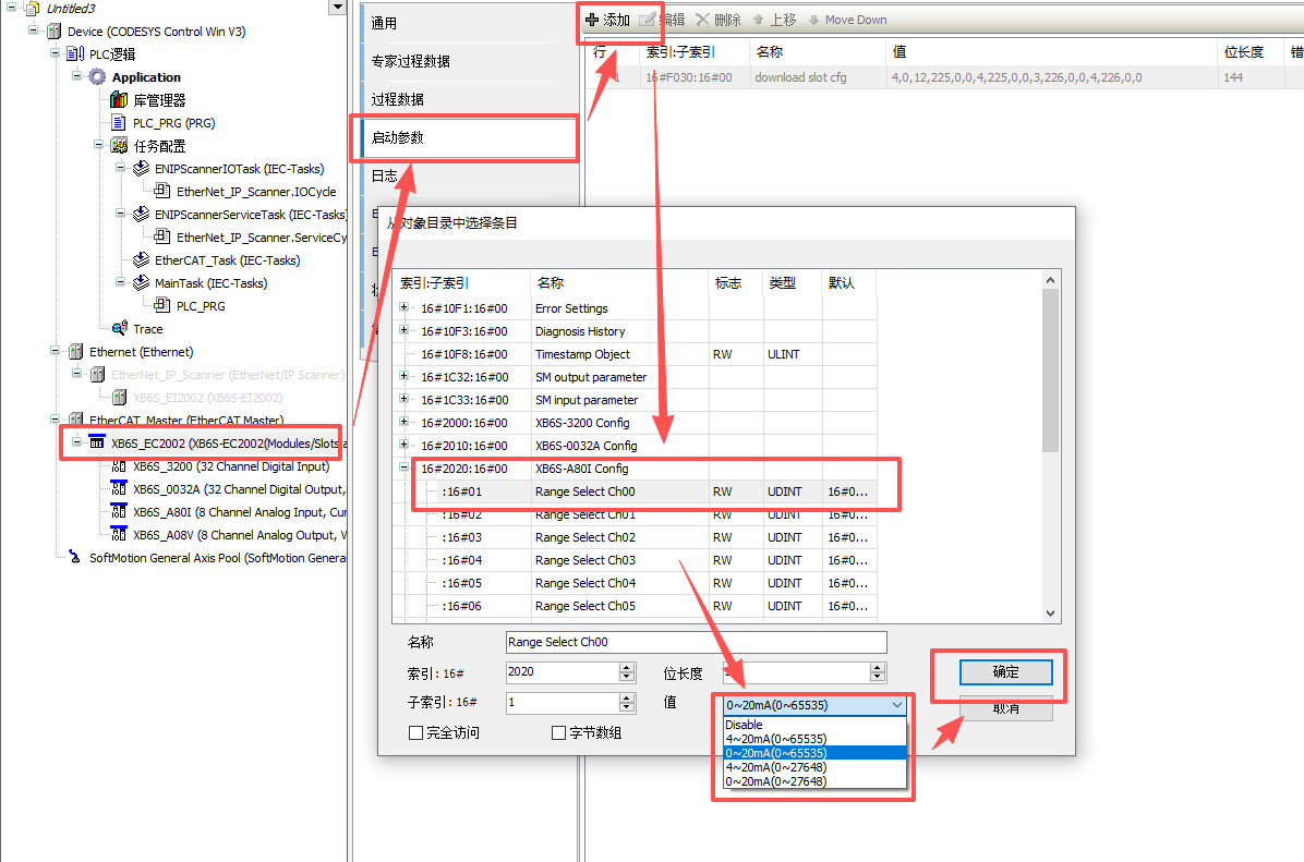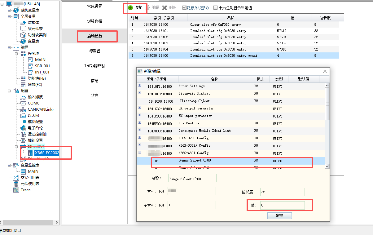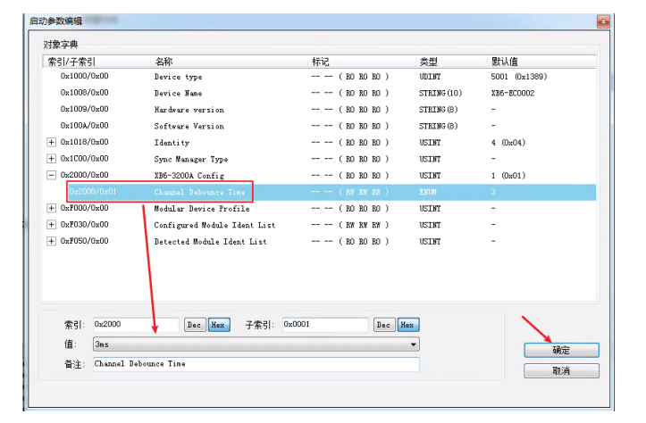 双击“XB6S-EC2002耦合器图标”并选择启动参数(SDO)选项,点击上方“+添加”按钮,选择对应模块的Config参数,更改值到所需配置,点击确定,下载生效。