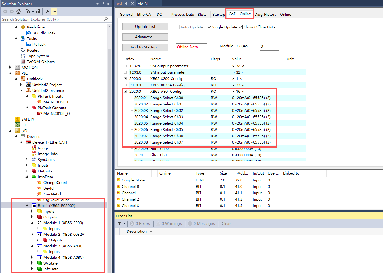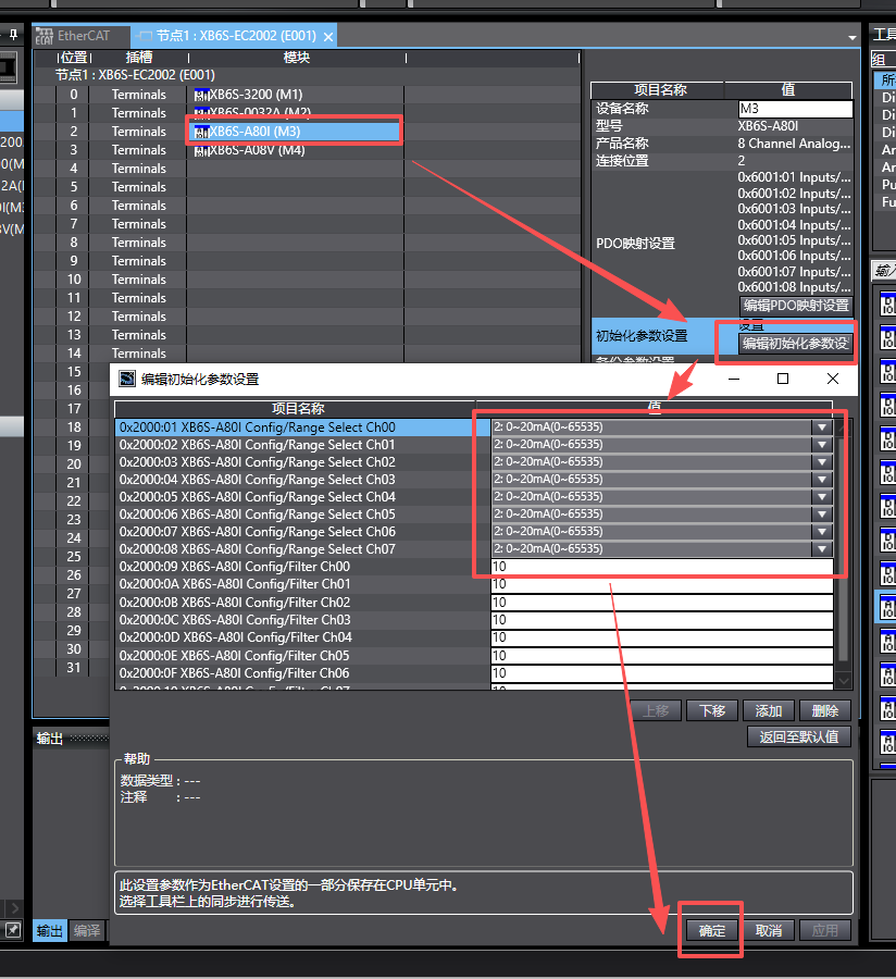 EtherCAT设定界面双击“XB6S-EC2002耦合器图标”,在“启动参数”点击左上侧的“+”添加启动参数指令。启动参数指令对应的是模块的 SDO 参数配置,依照手册如上图所示将XB6S-A80ID模块的量程调至所需配置。添加完指令后下载程序,下载完成后子模块立即生效。