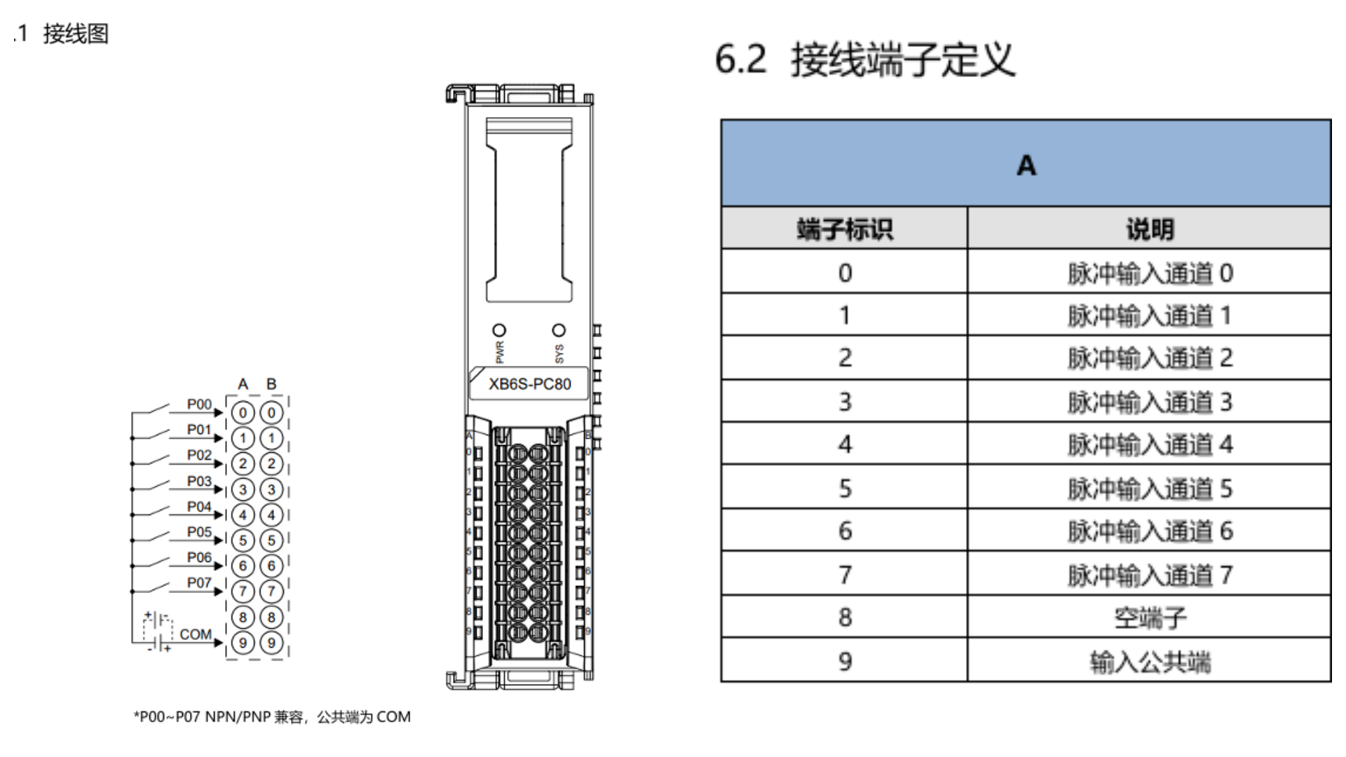 In this example, a pulse generator (NPN type) is used. Therefore, the physical wiring involves connecting the pulse output to A0 and the 24V supply to A9 (i.e., COM).