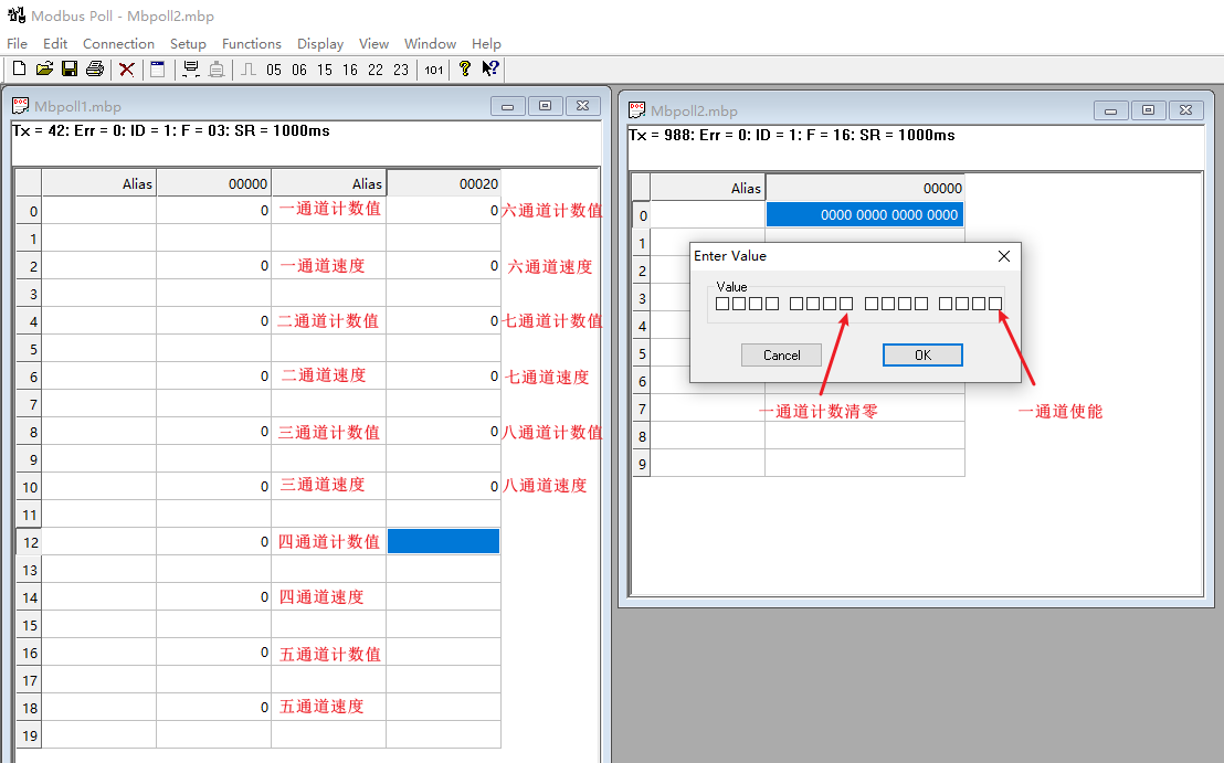 The count value and speed for each channel are 4 bytes each and should be viewed as 'Long (32-bit)'. The enable and clear data are 1-bit and should be viewed as 'Binary'.