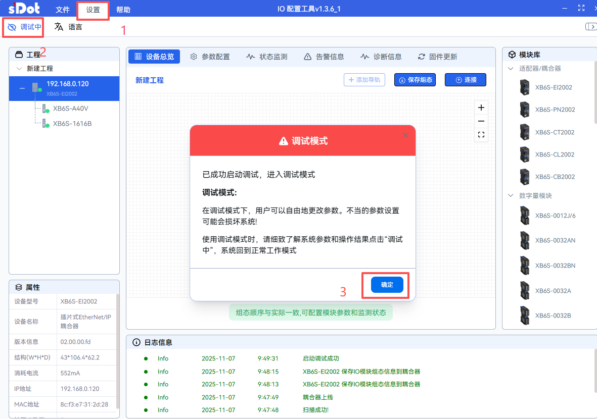 Once both the coupler and sub-modules are successfully scanned, click "Settings" to enter the module debugging interface.
