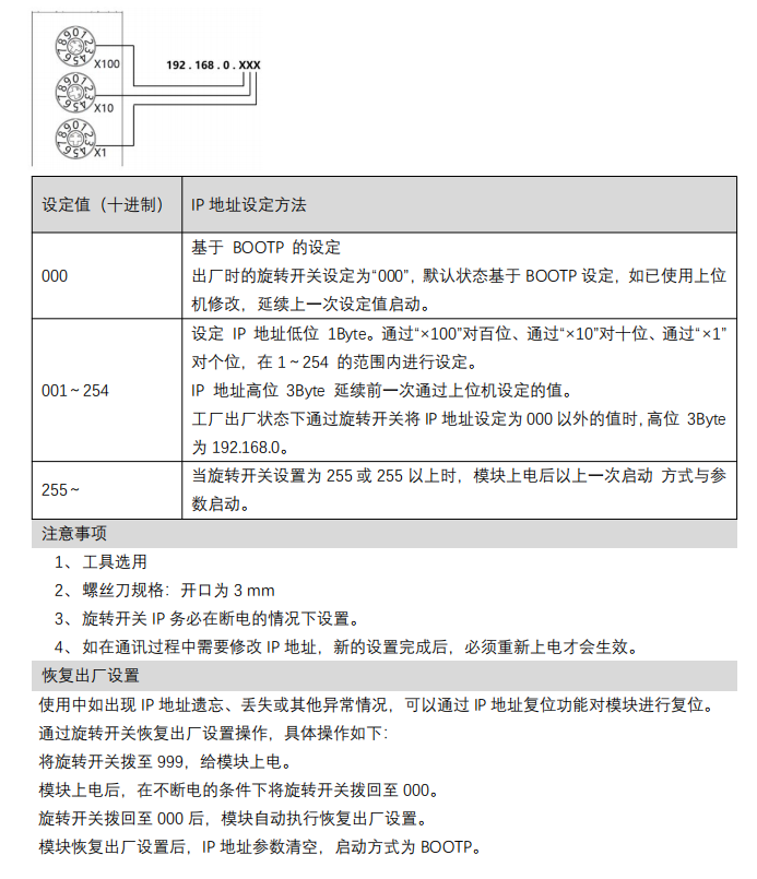 The default IP is 192.168.0.120, and the default rotary switch setting is 000. These can be kept or modified as needed.