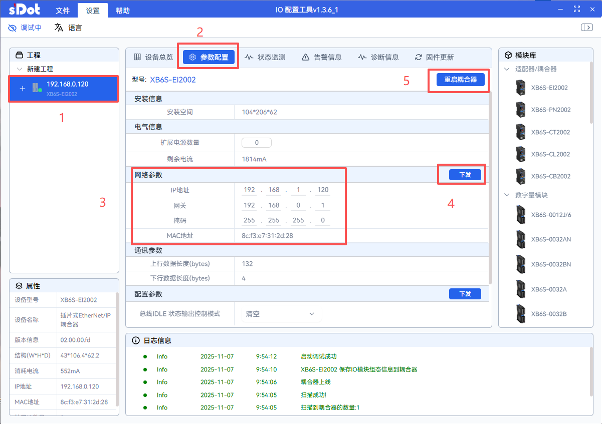 Click on the coupler, select "Parameter Configuration", modify the network parameters, then click "Download". Finally, click "Restart Coupler".