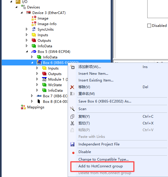 In the TwinCAT project tree, right-click the slave to be protected (XB6-EC2002STin this example) and select Add to Hot Connect Groups.