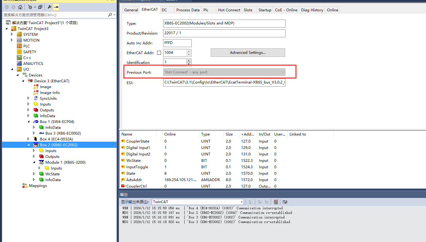 This is not a distributor issue, but rather because TwinCAT does not enable Hot Connect by default. This article uses the Solidot SW4-ECP04 4-port distributor as an example to demonstrate how to configure Hot Connect for free hot-swapping of slaves.