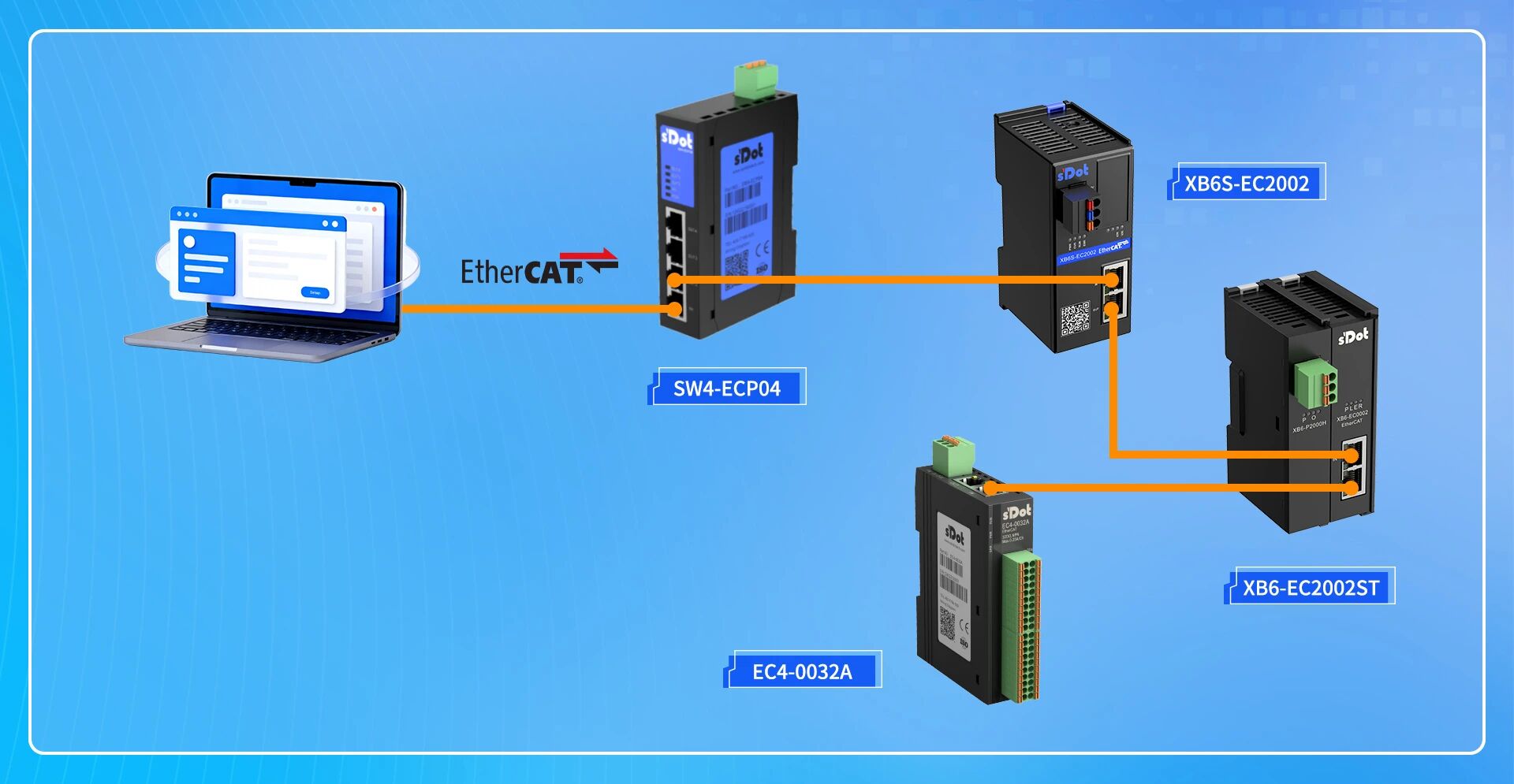Connect the PC (TwinCAT master) to the IN port of the SW4-ECP04, then connect from the three OUT ports to: