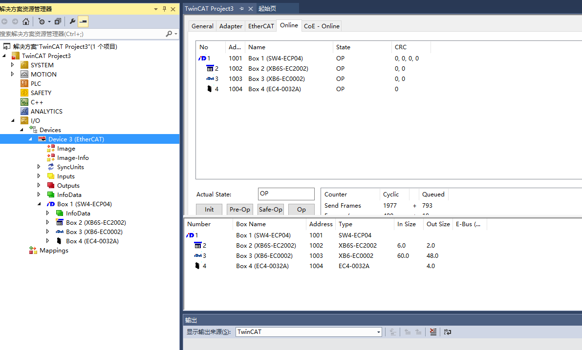 Open TwinCAT, locate I/O → Devices in the left project tree, right-click and select Scan to scan all EtherCAT devices. After scanning, all slaves are correctly recognized.