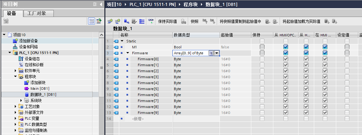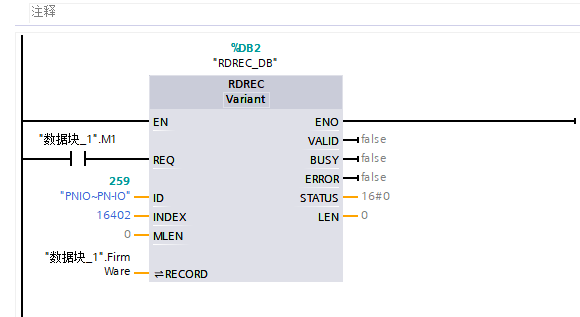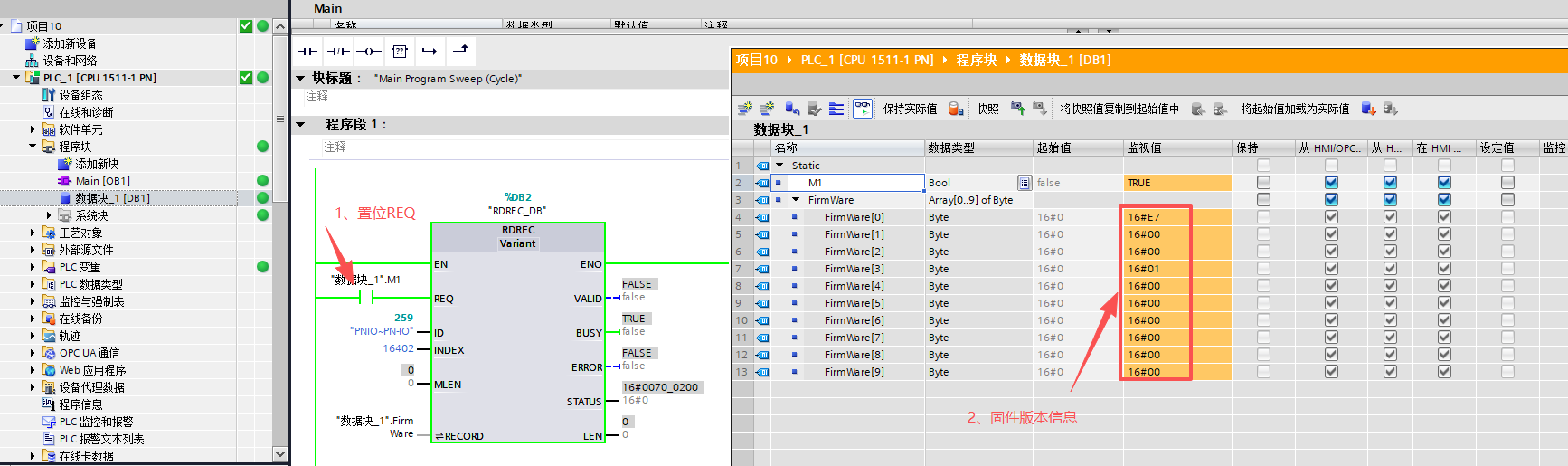 After completing the above configuration, download the program to the PLC. Monitor the FirmWare array in the DB block online. After assigning a value to M1, check the data returned by the RECORD pin, which is the current firmware version information of the XBF4-PN04 coupler.