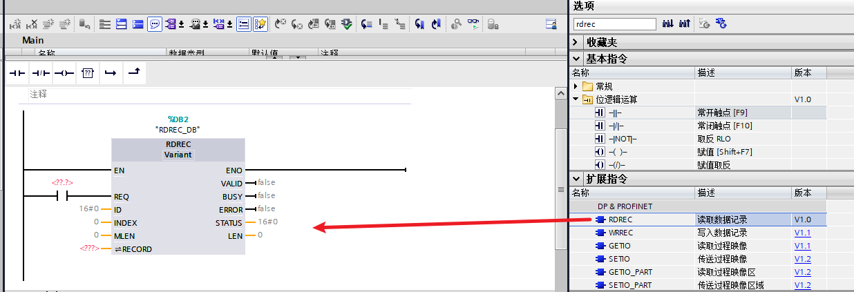 Find the RDREC function block from the instruction library and drag it into the program segment.
