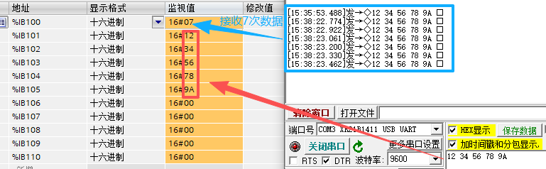 When the serial assistant sends data seven times, IB100 counts 7 receptions, and IB101-IB105 show the received data.