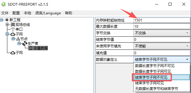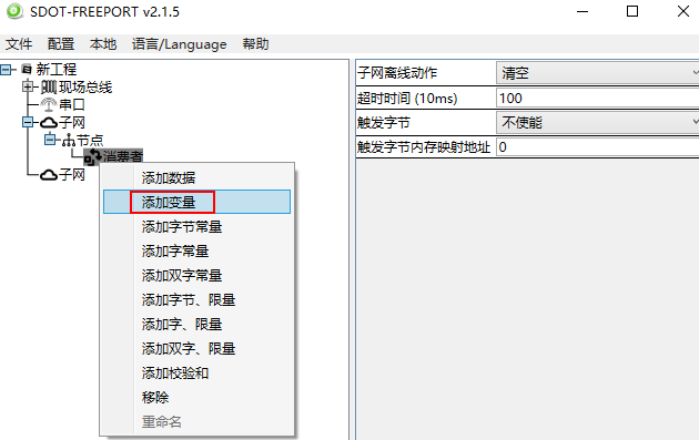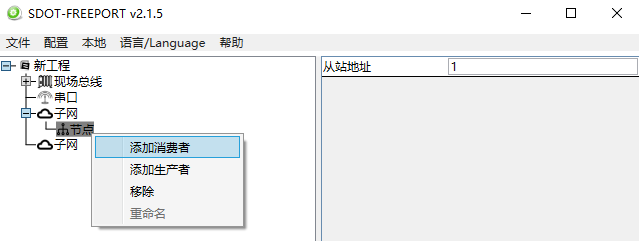 Right-click the "Subnet" to add a "Node", then right-click the "Node" to add a "Producer". Keep the slave address as the default value of 1 (currently non-functional).