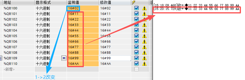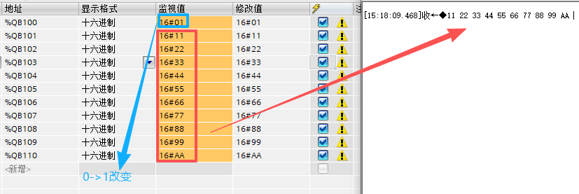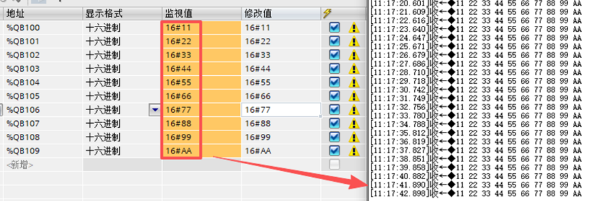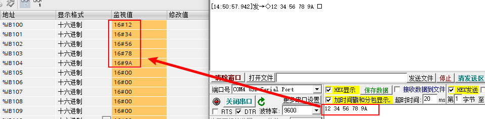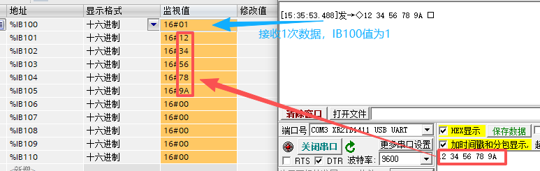 Monitoring: When the serial assistant sends data once, IB100 counts 1 reception, and IB101-IB105 show the received data.