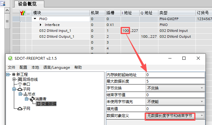 bytes. This corresponds to TIA Portal addresses IB100-IB104. (Note: If the Memory Mapping Start Address is configured as 4, it corresponds to TIA Portal addresses IB104-IB108. Important: The address length allocated in TIA Portal can be greater than or equal to the Max Data Length configured in the software).