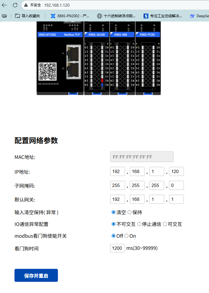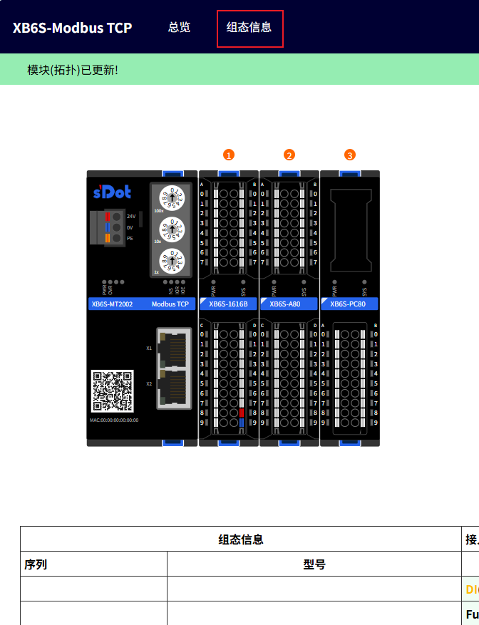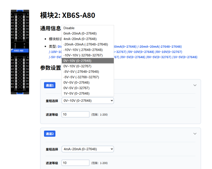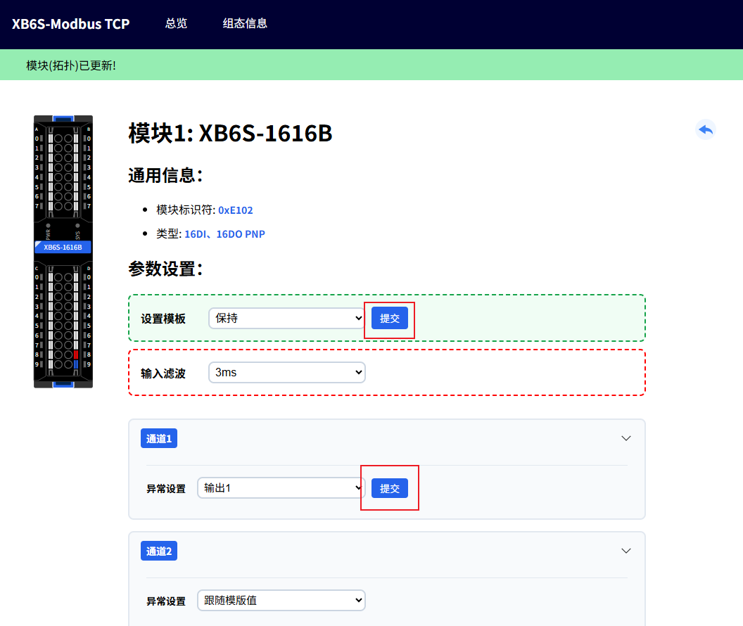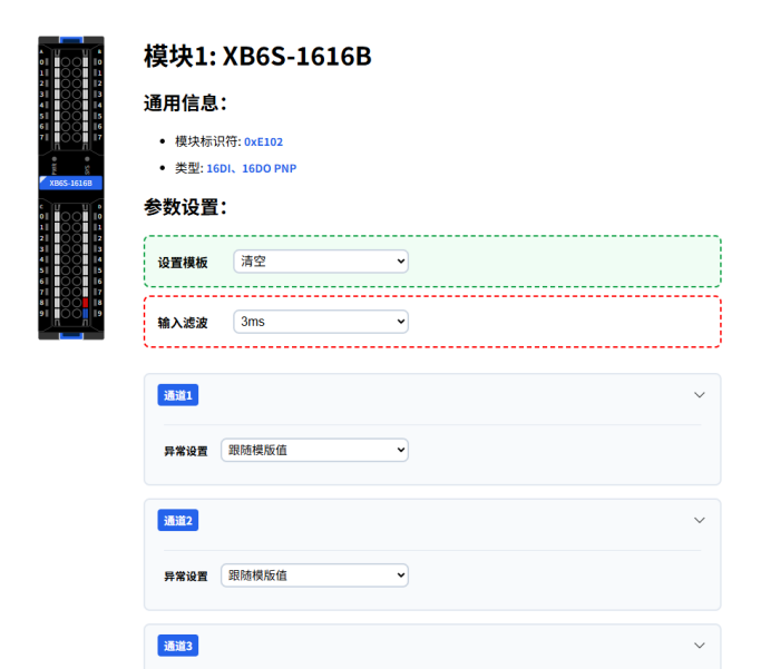 In the Web interface, click on the corresponding module to enter its I/O parameter configuration interface. The example below shows changing configuration parameters of XB6S-1616B and XB6S-A80.
