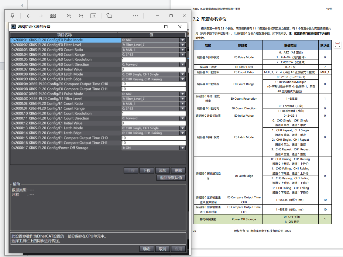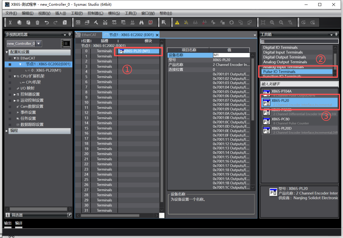 The XB6S-PL20 is a remote I/O incremental encoder counting module from Solidot. It can connect two external 24V single-ended incremental encoders and supports functions such as Z-phase reset, comparison output, and probe latch. This article provides a step-by-step demonstration of operating the XB6S-PL20 with the XB6S EtherCAT coupler in Sysmac Studio.