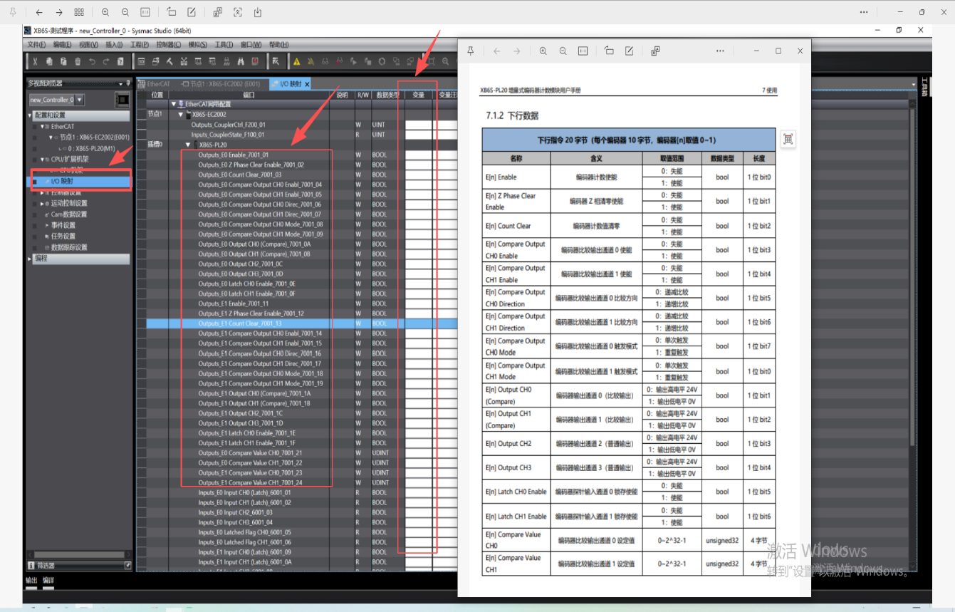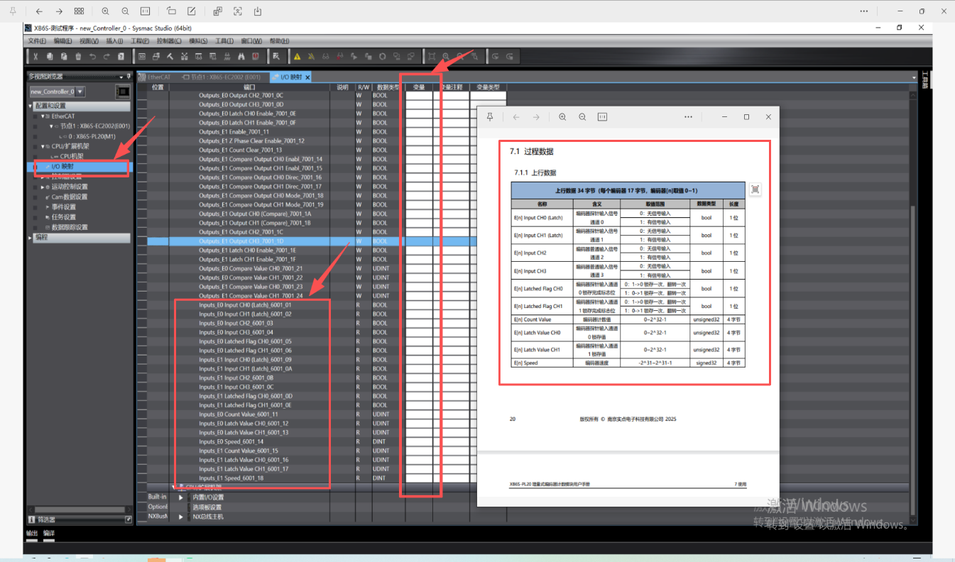 Click "I/O Mapping" on the left side of the interface, select the corresponding coupler, expand the submodules to view specific PDO entries. Refer to the process data description in the product manual, bind the corresponding variables, and then you can read from and write data to the module. For specific function usage, please refer to relevant examples in the product manual or contact our technical support team.
